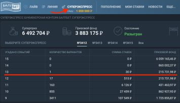 Суперэкспресс – аналог тотализатора, в котором букмекерская контора предлагает угадать исходы 15 футбольных матчей. При этом турниры и команды не самые известные, например кубок Дании, чемпионат Коста-Рики и Панамы. Призовой фонд суперэкспресса растет после каждого розыгрыша. Если вы один угадаете все 15 событий, то заберете суперприз. Но можно выиграть и угадав меньше исходов. Например, в розыгрыше 26 апреля только один игрок угадал 13 исходов и выиграл 215 тысяч рублей при ставке в 30 рублей.
