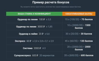 Бонусы – в этом разделе букмекерская контора объясняет как накопить, потратить бонусы и показывает пример расчета бонусов. Это накопительные бонусы, которые автоматически появляются, когда вы делаете ставку.