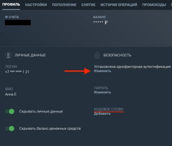 Профиль – раздел с данными, который вы указали при регистрации. Тут же вы можете установить двухфакторную аутентификацию, изменить пароль для входа и добавить кодовое слово. Это поможет дополнительно защитить аккаунт. Вы можете скрыть личные данные и баланс счета, если не хотите, чтобы кто-то случайно увидел эту информацию.
