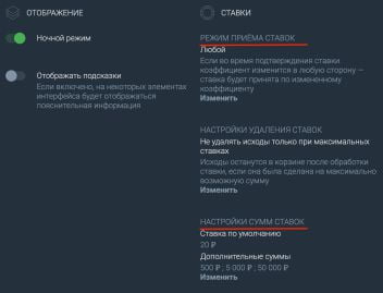Настройки – переключение темы оформления на светлую или темную, включение подсказок. Также вы можете выбрать, принимать ли изменения коэффициентов при оформлении пари, указать сумму ставки по умолчанию и дополнительные суммы ставок. «Балтбет» также предлагает выбрать виды спорта для отображения, но у нас не получилось – они отображались по умолчанию, ничего не менялось. Также можно подписаться на рассылку.