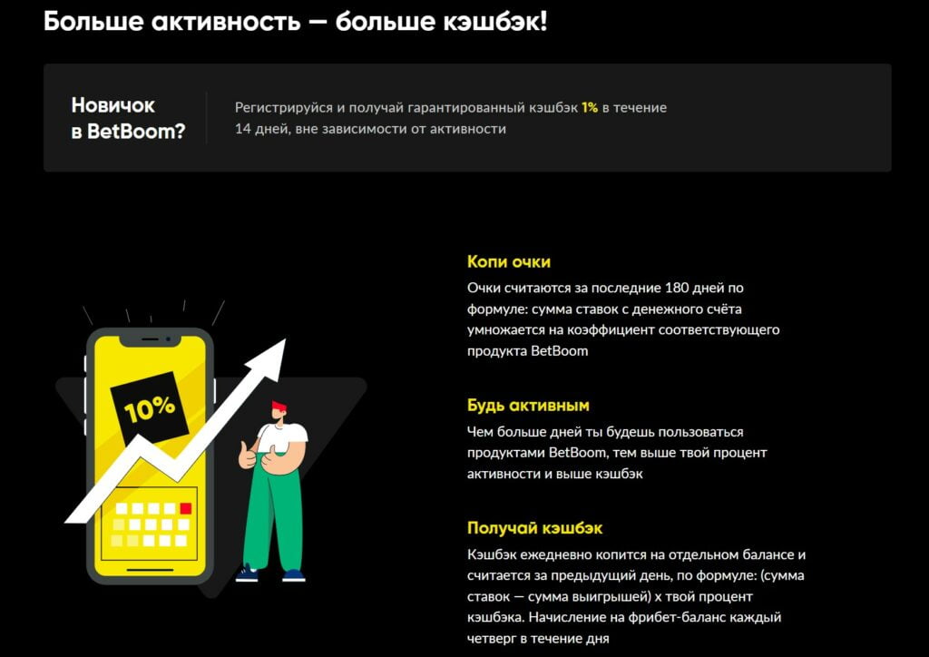 Букмекерская контора BetBoom предлагает клиентам кэшбек от 1% до 10% в зависимости от активности клиента за последний 180 дней.