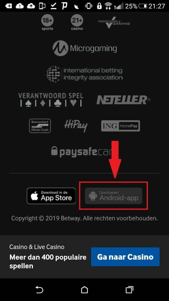 Если вы не увидите вверху баннера с надписью Betway Sports, прокрутите страницу вниз и нажмите на кнопку с надписью «Android-app».