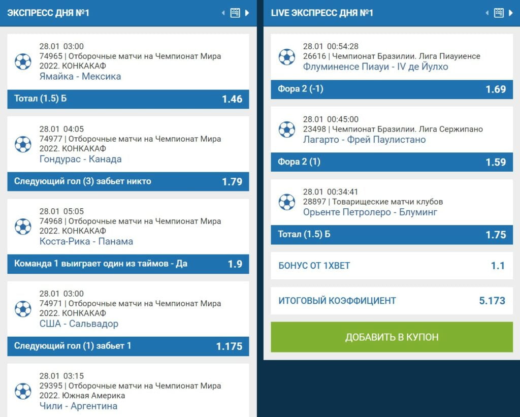 Ежедневно в букмекерской конторе 1xBet действует акция «Экспресс дня», согласно которой каждый участник может получить 10% к выигрышу за свою ставку. Для этого необходимо оформить пари на предложенные исходы, объединенные в экспрессы по линии live и прематч. К итоговому выигрышу букмекер прибавит 10% (эта сумма уже заложена в коэффициент), но если вы проиграете, то никакие бонусы не получите.