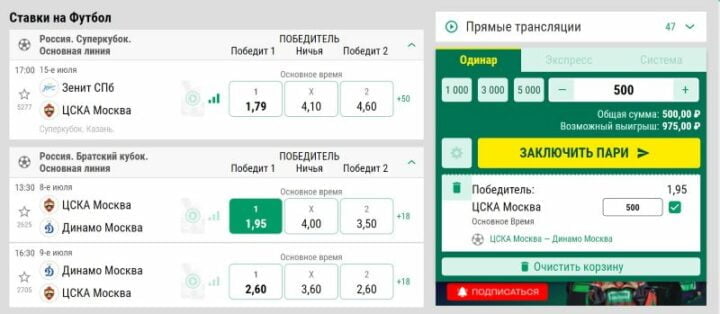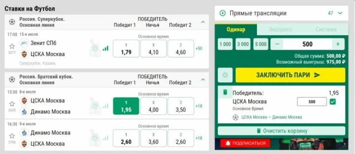 После успешного пополнения баланса, вы готовы к размещению ставок. В букмекерской конторе находится широкий выбор спортивных событий в линии. Чтобы добавить интересующий вас исход в купон, просто нажмите на соответствующий коэффициент в росписи и следуйте дальнейшим инструкциям для размещения ставки.