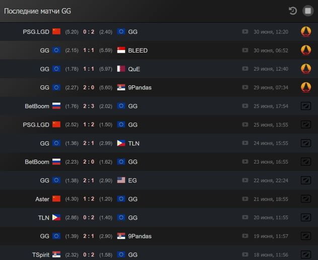 Зрителям, следящим за матчами во время трансляций, доступна полная информация о расстановке команд на карте и доходе персонажей. Это позволяет бетторам анализировать игру и делать ставки на киберспорт в режиме реального времени. Самим игрокам видна информация, связанная только с их собственной командой. Ставки на исход матча Этот вид ставок является самым популярным в мире киберспорта и других дисциплин. В Dota 2 ничьи встречаются только в формате bo2, что означает, что выбор ограничивается П1 и П2. Вы можете делать ставки на победу фаворитов с небольшими коэффициентами или на аутсайдеров с более высокими. В любом случае важно найти закономерность и придерживаться ее. Например, во второй половине июня 2023 года команда "Gaming Gladiators" продемонстрировала отличную форму: из 13 матчей они победили в 10, сыграли дважды вничью и проиграли один раз. Поэтому выбор беттора в пользу "GG" на основе статистики выступлений выглядит логичным.