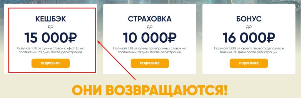 В БК 1хСтавка клиентам доступен кэшбек до 15 000 рублей. Возврат составляет 10% от проигранных ставок с момента начала участия в акции «Они возвращаются», но не может быть больше первого депозита. В расчет берутся проигранные одиночные ставки с коэффициентом от 1.50 и более или экспрессы, состоящие минимум из трех событий. При этом, каждый исход в экспресс должен иметь коэффициент не ниже 1.50.Сумма кэшбека начисляется пользователю в виде промокода на бесплатную ставку, которую необходимо поставить на экспресс из трех исходов с коэффициентом каждого от 1.80.