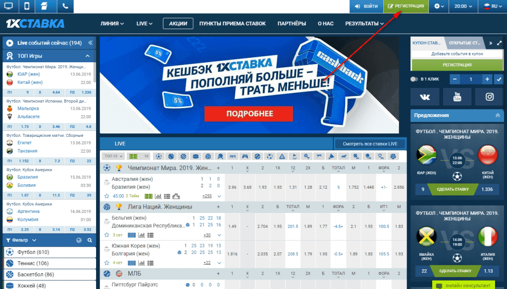 На главной странице БК 1хСтавка нажмите кнопку “Регистрация”.