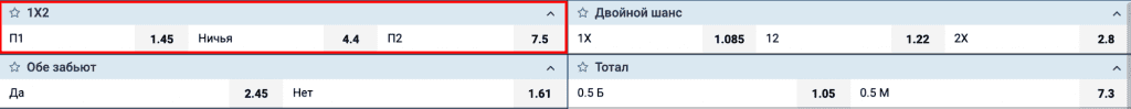 Даже “не разворачивая” матч можно увидеть варианты для ставок на основной исход поединка в линии.
