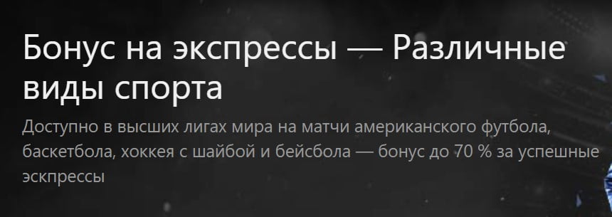 - Начинайте делать ставки вида экспресс на события из линии прематч на определенные соревнования: хоккей, баскетбол, американский футбол, бейсбол, хоккей с шайбой (подробнее о доступных лигах читайте на странице акции на сайте букмекера).